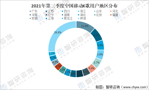 從地區(qū)分布來看,2021年第三季度廣東、江蘇、四川、浙江和山東五個省市移動K歌用戶占全國移動K歌用戶的37.0%,其中廣東移動K歌用戶占11.6%,占比最大;江蘇移動K歌用戶占8.0%;四川移動K歌用戶占5.9%;浙江移動K歌用戶占5.8%;山東移動K歌用戶占5.7%。