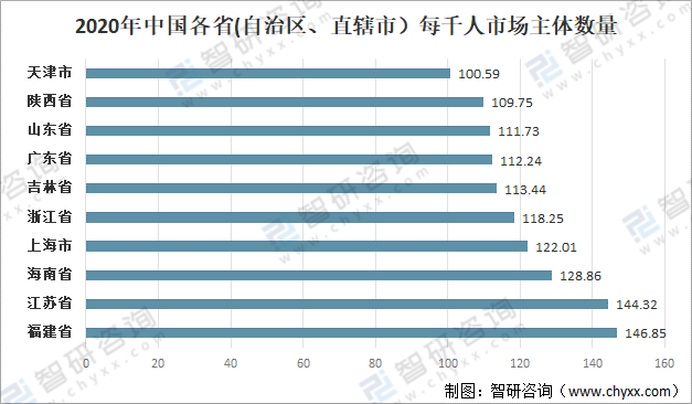 2020年,福建省每千人擁有市場主體數量146.85戶,排名第一;江蘇省每千人擁有市場主體數量144.32戶,排名第二;海南省每千人擁有市場主體數量128.86戶,排名第三;上海市每千人擁有市場主體數量122.01戶,排名第四;浙江省每千人擁有市場主體數量118.25戶,排名第五。
