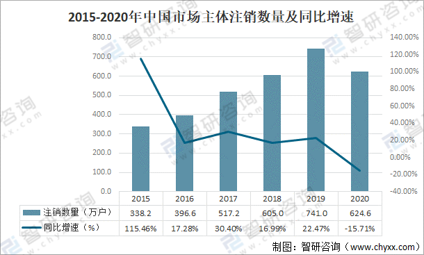 2015-2020年中國市場主體注銷數量及同比增速