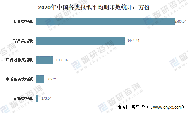 分種類來看,2020年中國專業類報紙平均期印數為8503.54萬份;綜合類報紙平均期印數為5444.44萬份;讀者對象類報紙平均期印數為1066.16萬份;生活服務類報紙平均期印數為505.21萬份;文摘類報紙平均期印數為173.64萬份。