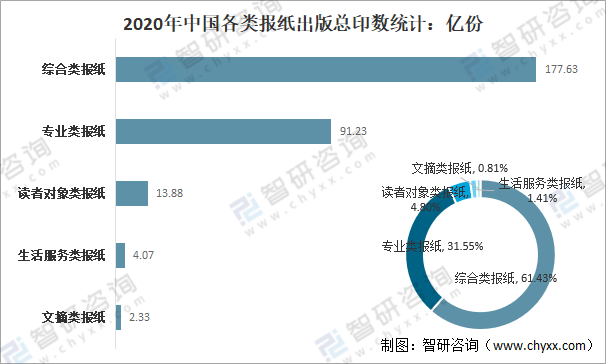 分種類來看,2020年中國綜合類報紙總印數為177.63億份,占全國報紙出版總印數的61.43%,占比非常大;專業類報紙總印數為91.23億份,占全國報紙出版總印數的31.55%;讀者對象類報紙總印數為13.88億份,占全國報紙出版總印數的4.80%;生活服務類報紙總印數為4.07億份,占全國報紙出版總印數的1.41%;文摘類報紙總印數為2.33億份,占全國報紙出版總印數的0.81%。