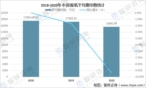 在中國報紙出版種類減少的同時,平均期印數也在減少,2020年中國報紙平均期印數為15692.99萬份,較2019年減少了1610.35萬份,同比減少9.31%。