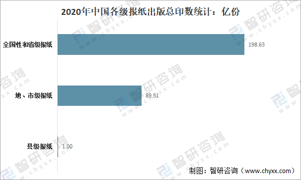 其中,2020年全國性和省級報紙總印數為198.63億份;地、市級報紙總印數為89.51億份;縣級報紙總印數為1.00億份。