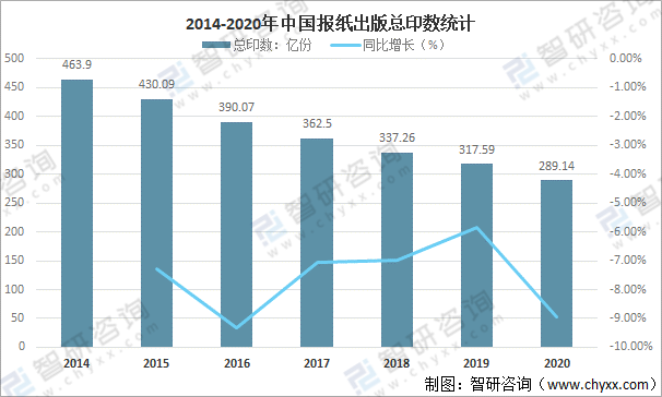 隨著中國報紙出版種類的減少,總印數也隨之減少,2020年中國報紙出版總印數為289.14億份,較2019年減少了28.45億份,同比減少8.96%。