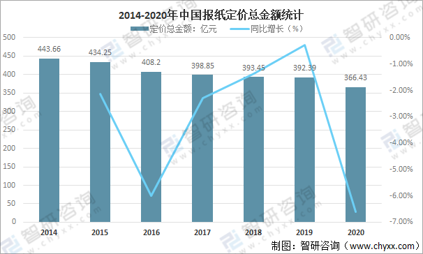 2014-2020年中國報紙定價總金額統計