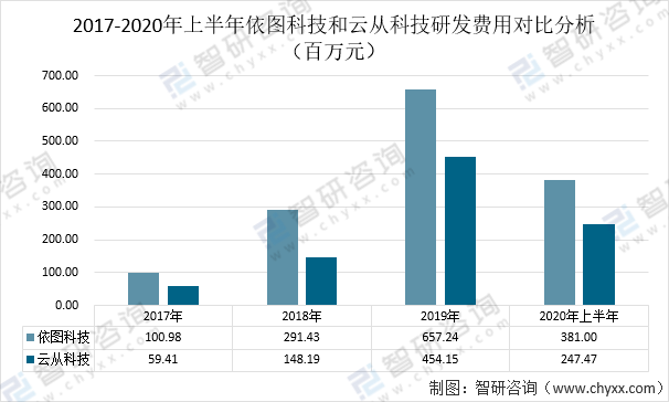 依圖科技2020年上半年的研發費用為381百萬元,2019年的研發費用為657.24元。云從科技2020年上半年的研發費用為247.47百萬元,2019年的研發費用為454.15百萬元。