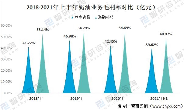 從奶油業務毛利率來看,奶油行業整體盈利較強,毛利率較高,海融科技與立高食品在2018-2020年期間毛利率均高于40%,但海融科技更勝一籌,2021年上半年海融科技奶油業務毛利率為48.97%,較立高食品的39.62%高出9.35個百分點。