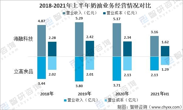 從奶油業務營收及成本來看,2018-2021年上半年海融科技奶油業務營收均高于立高食品,2021年上半年立高食品奶油業務實現營收2.13億元,海融科技奶油業務實現營收3.16億元,較立高食品高出1.03億元。