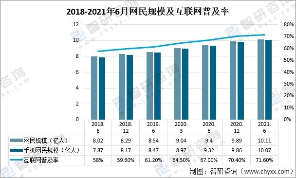 根據中國互聯網絡信息中心(CNNC)數據,到2021年6月,中國網民規模有11.11億人,其中手機網民規模為10.07億人,互聯網的普及率也達到71.60%。