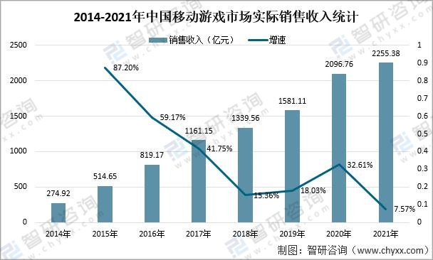 2020年,全球游戲市場規模達到近1,750億美元。2021年,中國游戲市場實際銷售收入2965.13億元,較去年增收178.26億元,同比增長6.4%。雖然收入依然保持增長,但在宅經濟效應逐漸衰減、爆款產品數量下滑影響下,增幅較去年同比縮減近15%。2021年中國移動游戲市場實際銷售收入達2255.38億元,較2020年增加了158.62億元,同比增長7.57%。