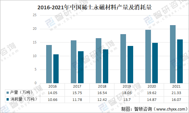 2016-2021年中國稀土永磁材料產量及消耗量