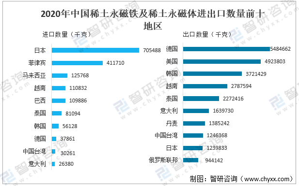 2020年中國稀土永磁鐵及稀土永磁體主要進口地區有日本、菲律賓及馬來西亞等,其中從日本進口稀土永磁鐵及稀土永磁體705488千克;稀土永磁鐵及稀土永磁體主要出口地區有德國、美國及韓國等,其中出口至德國稀土永磁鐵及稀土永磁體5484662千克。