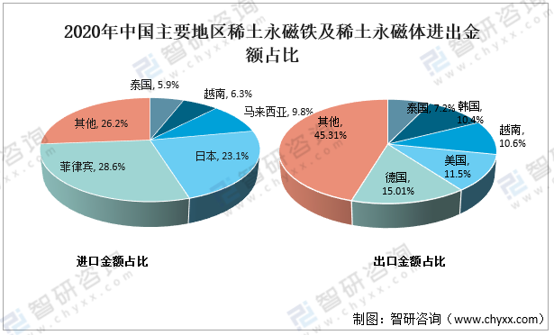 2020年中國主要地區稀土永磁鐵及稀土永磁體進出金額占比