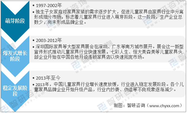 我國兒童家具行業始于1997年,目前已形成豐富的產品形態和穩定的消費群體,其發展可分為萌發、爆發式成長、穩定發展三個階段,當前行業處于第三階段后期,這一階段,兒童家具品牌開始創新產品,市場上涌現大量新的設計和產品類別。每個兒童家具品牌企業都開始升級自己的產品,抄襲、假冒等不良現象在行業內逐漸減少。