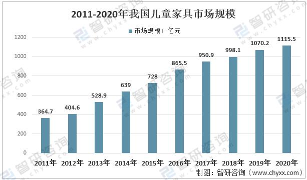 2011年,我國兒童家具市場規模為364.7億元;2020年,兒童家具市場規模增長至1115.5億元,2011年以來兒童家具市場規模復合增速為13.23%。