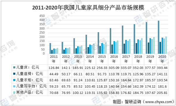 2011-2020年我國兒童家具細分產品市場規模統計圖