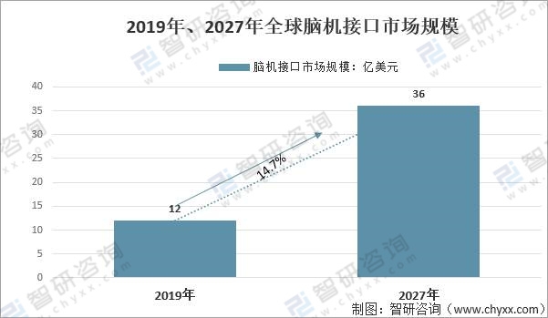 2019年、2027年全球腦機接口市場規(guī)模