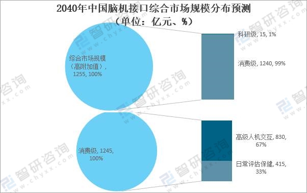 2040年中國腦機接口綜合市場規(guī)模分布預測(單位:億元、%)