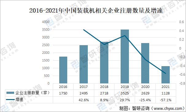 2016-2021年中國裝載機相關(guān)企業(yè)注冊數(shù)量及增速