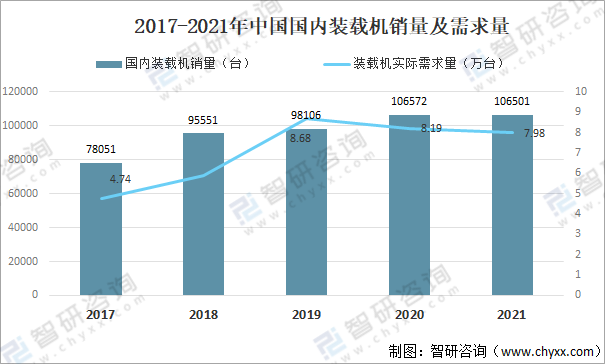 2021年中國國內(nèi)裝載機銷量為106501臺,同比下降0.1%;裝載機實際需求量為7.98萬臺,同比下降2.6%。