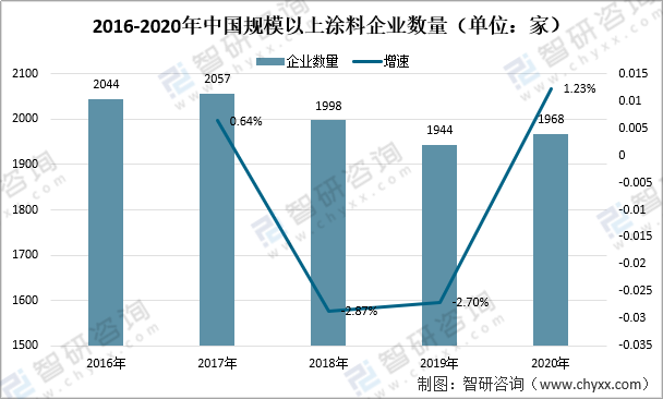 據(jù)中國涂料工業(yè)協(xié)會數(shù)據(jù)顯示,2016-2020年,中國涂料規(guī)模以上企業(yè)數(shù)量雖然有減少,但基本穩(wěn)定在1900家的規(guī)模以上。2020年,中國規(guī)模以上涂料企業(yè)數(shù)量為1968家,相比2019年略有增加,同比增漲1.23%。