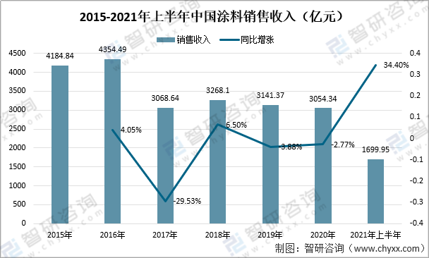 2015-2021年上半年中國涂料銷售收入(億元)