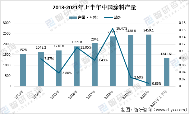 2013-2021年上半年中國涂料產(chǎn)量