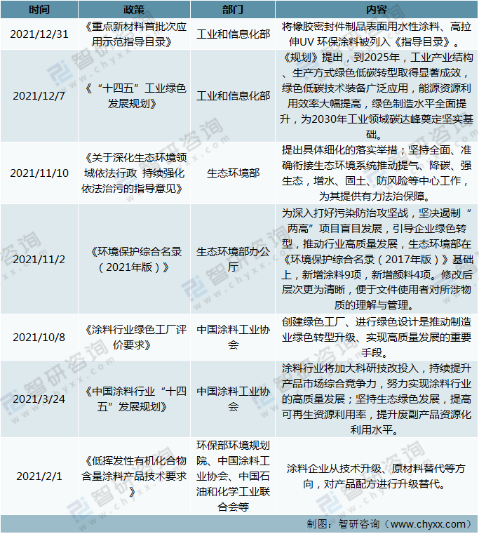 隨著行業(yè)的持續(xù)發(fā)展,由于產(chǎn)品及生產(chǎn)環(huán)節(jié)對環(huán)境污染破壞性較大,我國政府先后出臺相關(guān)政策,鼓勵環(huán)境友好、資源節(jié)約型涂料發(fā)展,引導(dǎo)涂料行業(yè)發(fā)展趨向綠色、環(huán)保化。2021年3月,中國涂料工業(yè)協(xié)會向全行業(yè)發(fā)布了《中國涂料行業(yè)“十四五”發(fā)展規(guī)劃》。規(guī)劃包括了產(chǎn)業(yè)發(fā)展規(guī)劃、科技管理發(fā)展規(guī)劃、環(huán)保發(fā)展規(guī)劃以及政策法規(guī)與標(biāo)準(zhǔn)發(fā)展規(guī)劃。2021年我國中央部門出臺相關(guān)政策如下: