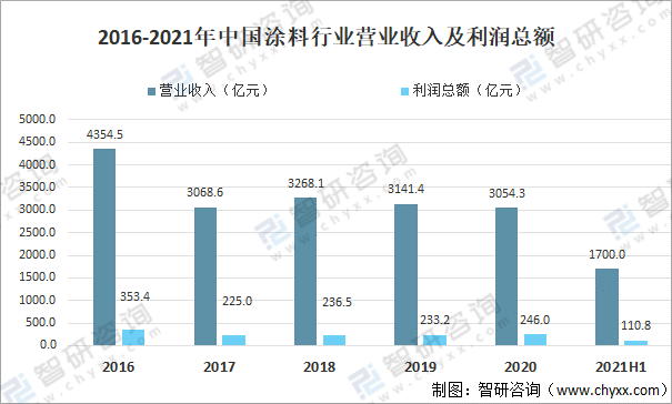 據中國涂料工業協會數據,2017-2020年中國涂料營業收入維持在3000億元左右,其中2021年上半年中國涂料行業營業收入為1700億元,利潤總額為110.8億元。