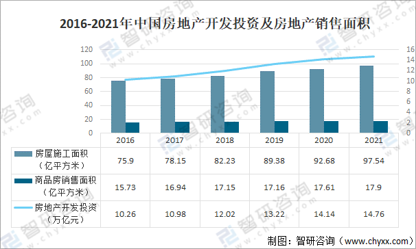 2021年中國房地產開發投資金額為14.76萬億元,同比增長4.4%;房屋施工面積為97.54億平方米,同比增長5.2%;商品房銷售面積為17.9億平方米,同比增長1.6%。