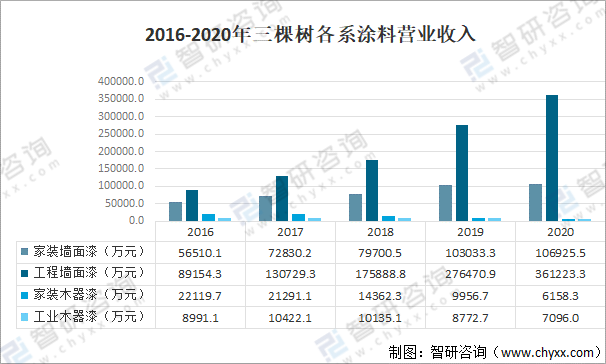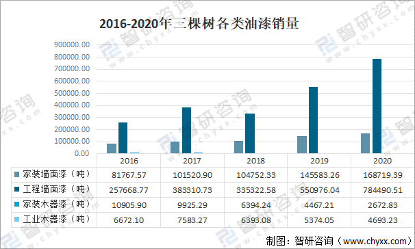 2020年三棵樹家裝墻面漆銷量為168719.39噸;工程墻面漆銷量為784490.51噸;家裝木器漆銷量為2672.83噸;工業木器漆銷量為4693.23噸。