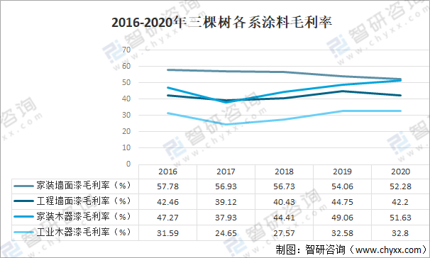 據公司公報數據,2020年三棵樹家裝墻面漆毛利率為52.28%;工程墻面漆毛利率為42.2%;家裝木器漆毛利率為51.63%;工業木器漆毛利率為32.8%。