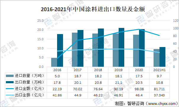 據中國海關數據,2021上半年中國涂料進口數量為9.7萬噸,進口金額為87.71億元;涂料出口數量為10.8萬噸,出口金額為37.343億元。