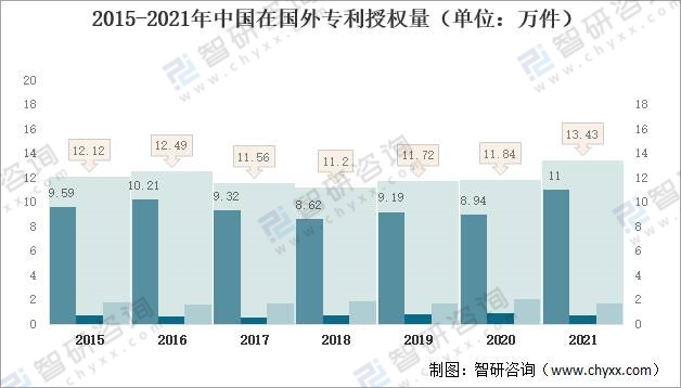 2021年,中國在國外專利授權量13.43萬件,較2020年增長1.59萬件。其中:發明專利授權量11萬件;實用新型專利授權量0.72萬件;外觀設計專利授權量1.71萬件。