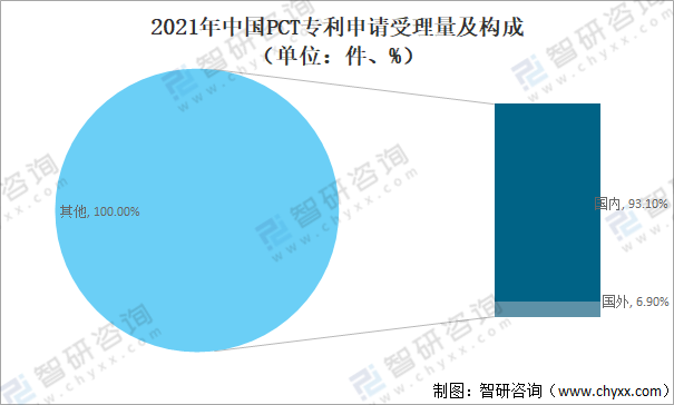 2021年中國PCT專利申請受理量及構成(單位:件、%)