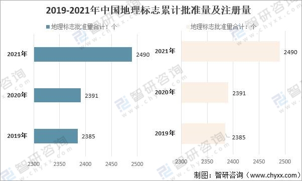 2021年,我國累計批準地理標志產品2490個,較2020年增長99個。累計核準地理標志作為集體商標、證明商標注冊6562件,較2020年增長477個。