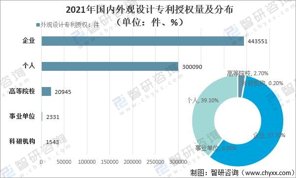 從國內外觀設計專利授權量及分布來看,高等院校外觀設計專利授權20945件,占2.7%;科研機構外觀設計專利授權1543件,占0.2%;企業外觀設計專利授權443551件,占57.7%;事業單位外觀設計專利授權2331件,占0.3%;個人外觀設計專利授權300090件,占39.1%。