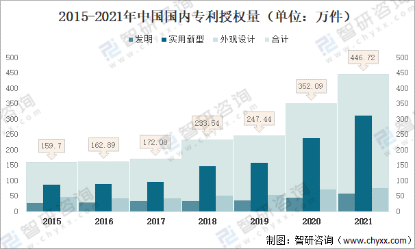 2021年中國國內專利授權也保持了高速增長,2021年中國國內專利授權量446.72萬件,較2020年增長446.72萬件,其中,發明專利授權量58.59萬件;實用新型專利授權量311.28萬件;外觀設計專利授權量76.85萬件。