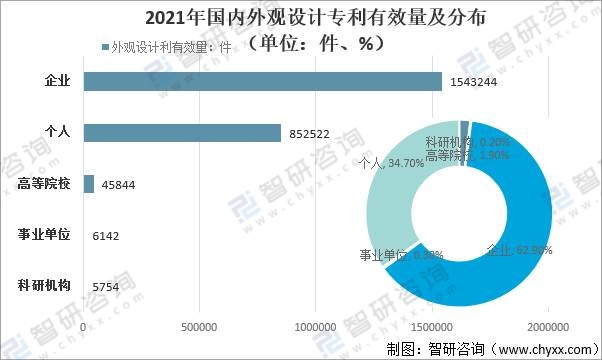2021年國內高等院校擁有外觀設計利有效量45844件,占1.9%;科研機構擁有外觀設計利有效量5754件,占0.2%;企業擁有外觀設計利有效量1543244件,占62.9%;事業單位擁有外觀設計利有效量6142件,占0.3%;個人擁有外觀設計利有效量852522件,占34.7%。