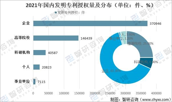 2021年國內發明專利授權量中高等院校發明專利授權146439件,占25.0%;科研機構發明專利授權40587件,占6.9%;企業發明專利授權370946件,占63.3%;事業單位發明專利授權7115件,占1.2%;個人發明專利授權20823件,占3.6%。