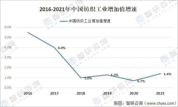 2016-2021年中國紡織工業增加值增速