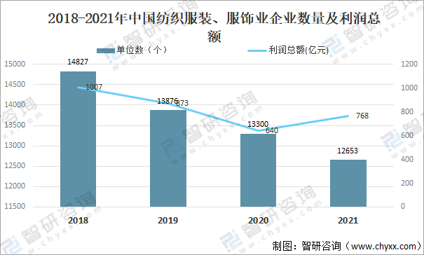 其中2021年中國紡織服裝、服裝業企業數量為12653個,同比下降4.9%;紡織服裝、服裝業企業利潤總額為768億元,同比增長19.9%。