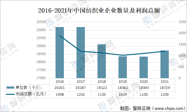 2016-2020年中國紡織業企業數量呈下降式走勢,2021年中國紡織業企業數量增加至18729個,同比增長2.1%;紡織業企業利潤總額為1203億元,同比增長8.8%。