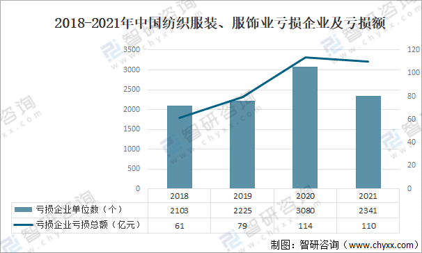 其中2021年中國紡織服裝、服裝業虧損企業數量為2341個,同比下降24%;中國紡織服裝、服裝虧損金額為110億元,同比下降3.2%。