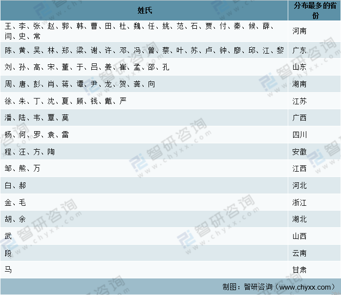 從整體分布看,王、李、張等二十二個姓氏人口分布最多的省份是河南;陳、黃、吳等二十個姓氏人口分布最多的省份是廣東;劉、孫、高等十二個姓氏人口分布最多的省份是山東;周、唐、彭等十一個姓氏人口分布最多的省份是湖南;徐、朱、丁等九個姓氏人口分布最多的省份是江蘇;潘、陸、韋等五個姓氏人口分布最多的省份是廣西;楊、何、羅等五個姓氏人口分布最多的省份是四川;程、汪、方等四個姓氏人口分布最多的省份是安徽;鄒、熊、萬三個姓氏人口分布最多的省份是江西;白、郝兩個姓氏人口分布最多的省份是河北;金、毛兩個姓氏人口分布最多的省份是浙江;胡、余兩個姓氏人口分布最多的省份是湖北;武姓、段姓、馬姓人口分布最多的省份分別是山西、云南和甘肅。