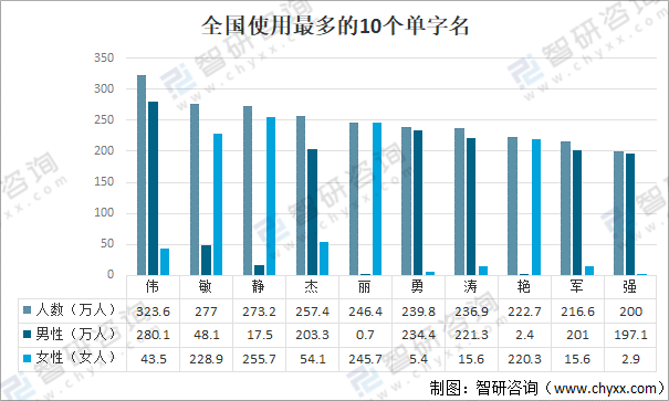 全國戶籍人口中,使用頻率最高的10個單字名依次為偉、敏、靜、杰、麗、勇、濤、艷、軍、強。其中“偉”名列榜首,使用人數為323.6萬。男性使用較多的單字名為偉、杰、勇、濤、軍、強;女性使用較多的單字名為敏、靜、麗、艷。