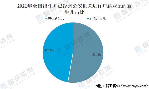 其中,男性新生兒468.1萬,較上年減少60.9萬,同比下降11.51%,占新生兒總數的52.75%;女性新生兒419.2萬,較上年減少55.3萬,同比下降11.65%,占新生兒總數的47.25%。