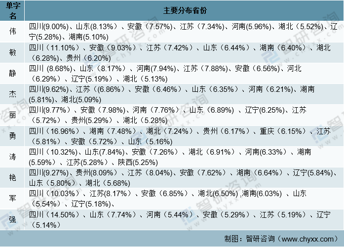 全國使用最多的10個單字名相對集中分布在四川、山東、安徽、河南、江蘇、湖北、湖南、遼寧等省份。此外,還有6.20%的“敏”、5.29%的“麗”、6.17%的“勇”、8.09%的“艷”分布在貴州;6.29%的“靜”分布在河北;6.15%的“勇”分布在重慶;5.25%的“濤”分布在陜西。