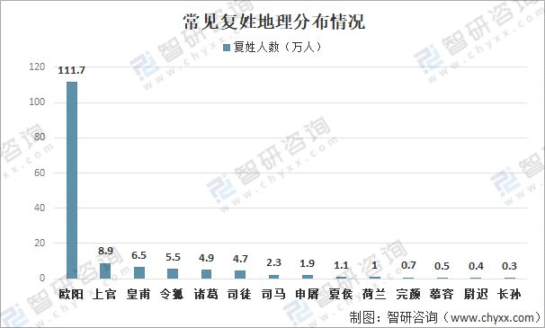 常見復姓“聚居”的特點非常突出,復姓人口在個別省份的分布較為集中。復姓“歐陽”人數111.7萬人,33.86%的人口分布在湖南;復姓“上官”人數8.9萬人,22.05%的人口分布在福建;復姓“皇甫”人數6.5萬人,32.72%的人口分布在河南;復姓“令狐”人數5.5萬人,75.60%的人口分布在貴州。