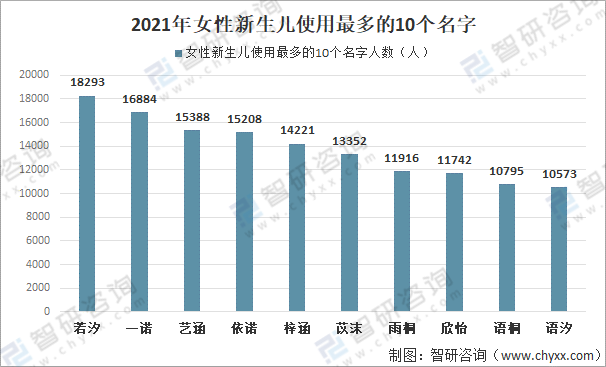 2021年出生并已經進行戶籍登記的女性新生兒中,使用頻率最高的10個名字依次為若汐、一諾、藝涵、依諾、梓涵、苡沫、雨桐、欣怡、語桐、語汐。與2020年相比,若汐、藝涵、苡沫首次進入前十,其中“若汐”使用人數達到1.8萬,登頂榜首,成為女性新生兒名字首選。